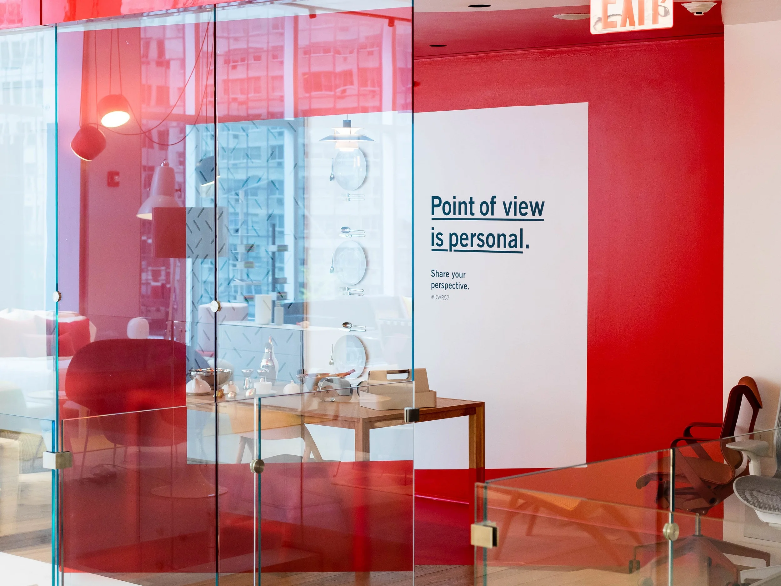 The centerpiece of Design Within Reach’s E57th Street Studio is the “hanging apartment”, a glass-enclosed cantilevered duplex where the consumer visually experiences a curated apartment at every level. The combination of red vinyl and paint communicates its message when standing at a certain point of view through layers on the glass and dry walls, floors, ceilings, and furniture.