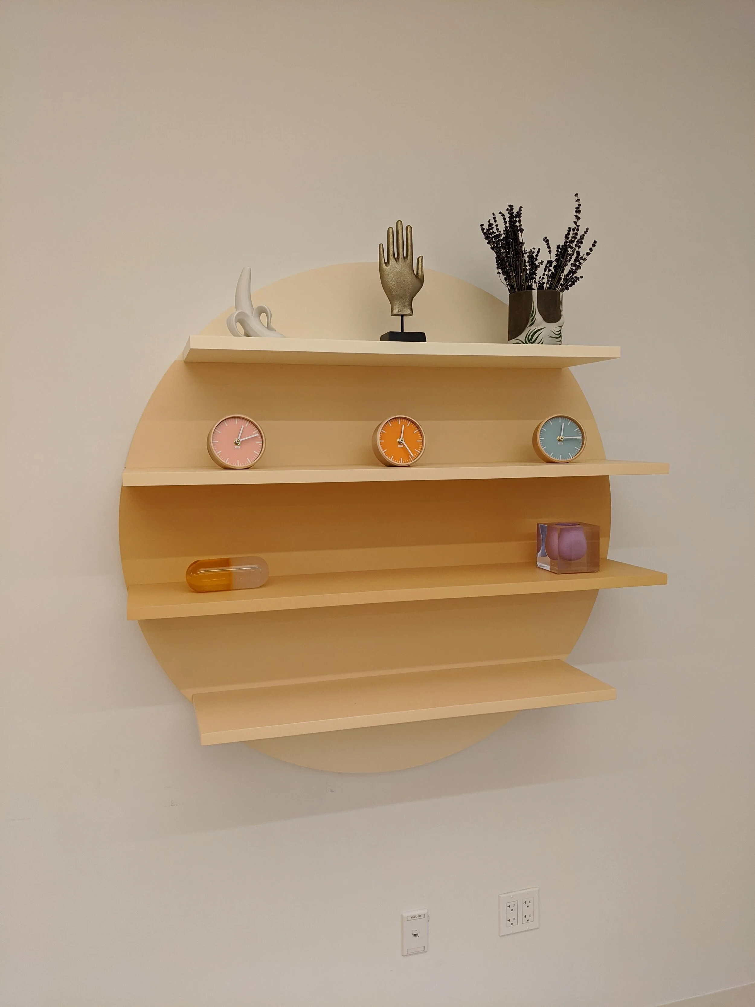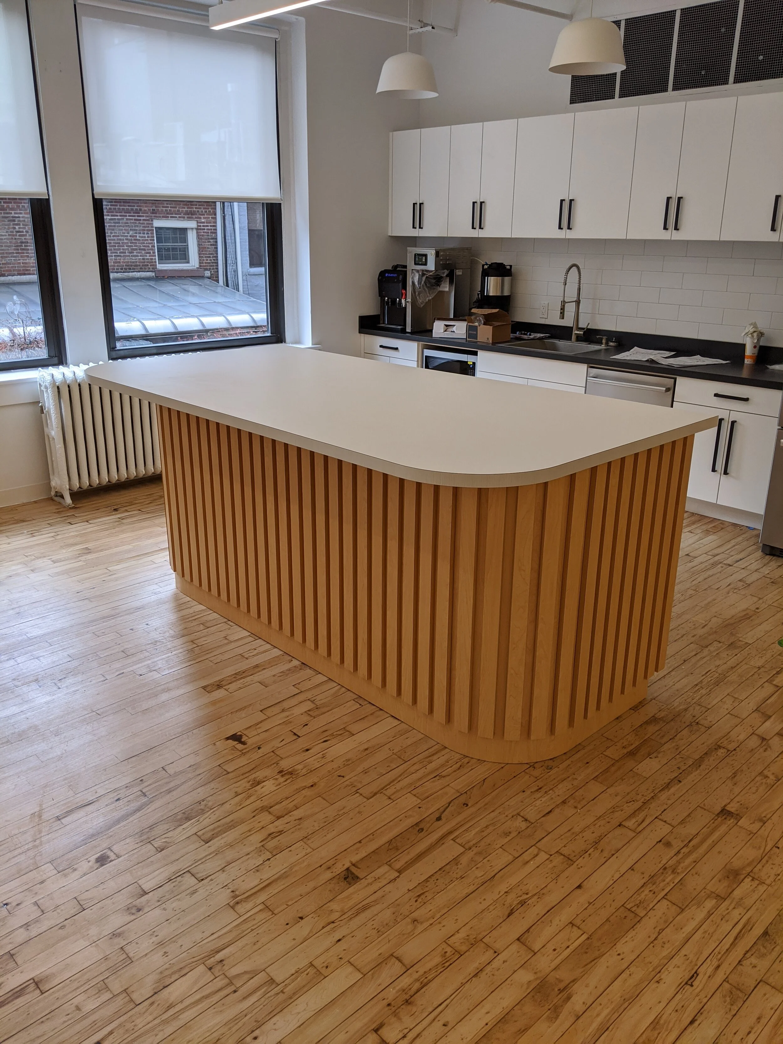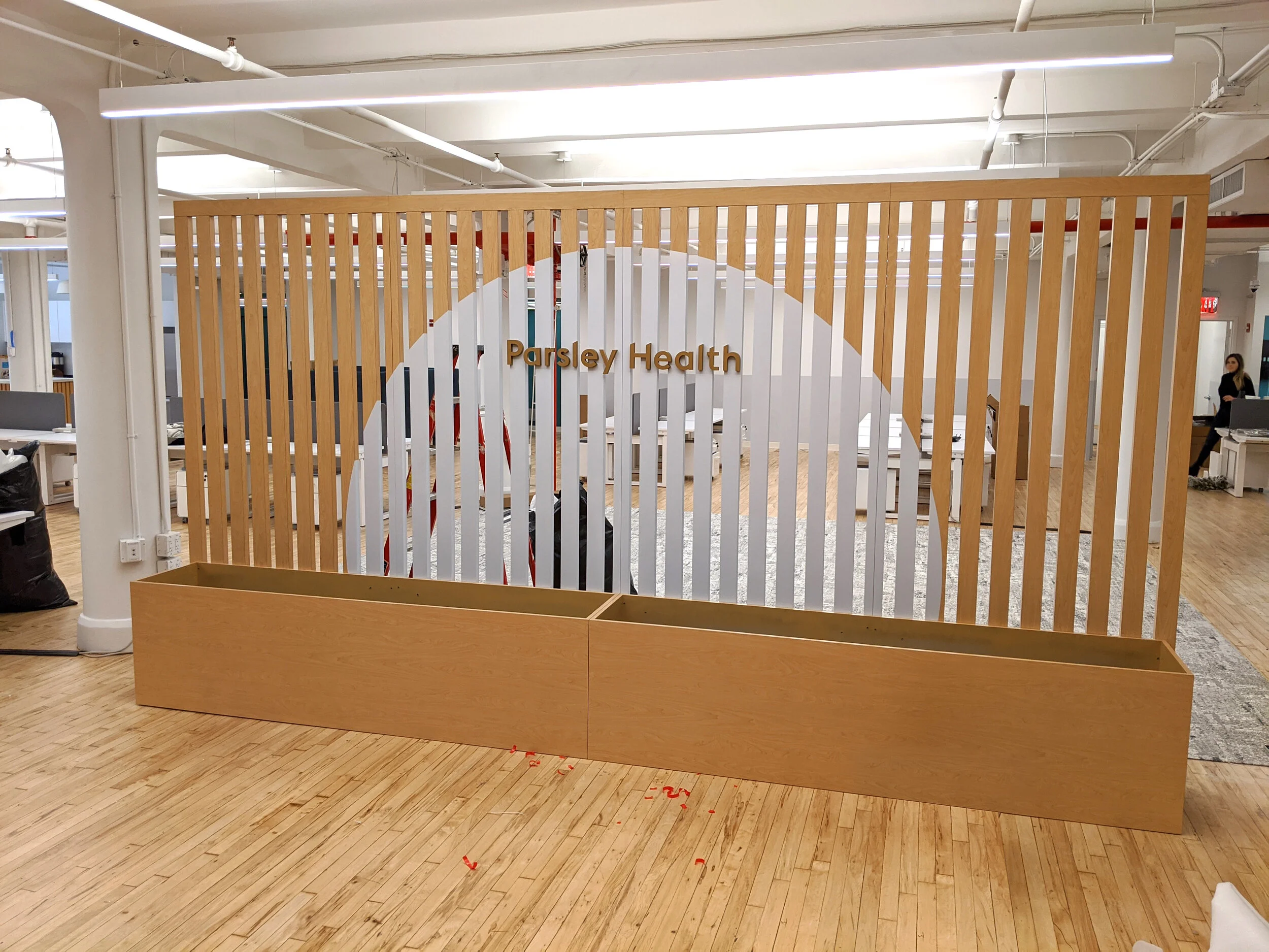 Knotel’s interior design department provided the vision. We provided the execution from cad drawings to fabrication while conforming with the office space’s already existing accents and colors and Parsley Health’s brand. The wall and the island heavily use birch laminates to match the flooring and off-the-shelf furniture. Neco painted the bookshelf with analogous warm/light colors of the space.